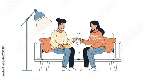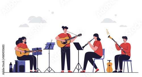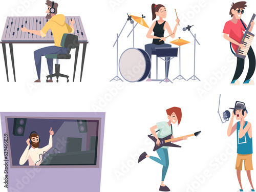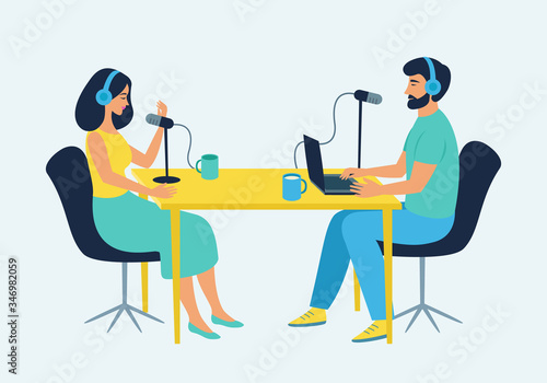 Mladý muž a žena ve sluchátkách nahrávání audio podcastu ve studiu s mikrofony, ploché vektorové ilustrace. Rozhlasový hostitel rozhovor s hostem. Podcasting, vysílání, online rádio.
