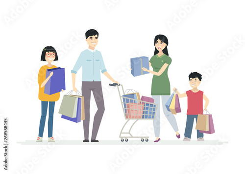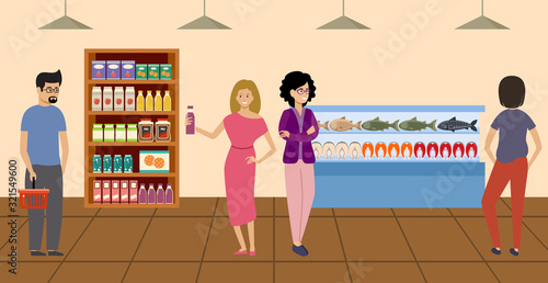 Lidé ve frontě na pokladnu v obchodě s potravinami nebo supermarketu koncept vektorové ilustrace. Zákazníci nakupují ovoce a zeleninu. Žena s vozíkem čeká na pokladně v obchodě s potravinami trhu.
