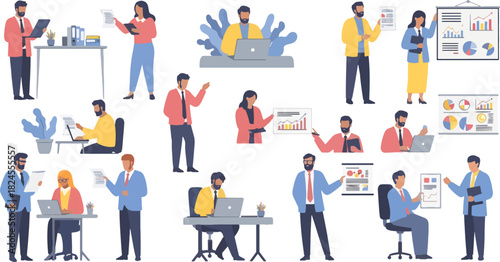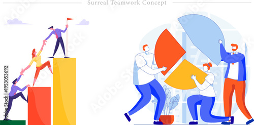 Lidé, kteří hledají do budoucnosti dalekohledem, dalekohledem, zatímco plovoucí na lodi, stojící na vrcholu hory, žebřík, ploché vektorové ilustrace. Vize budoucnosti, obchodní kariéra,vedení.