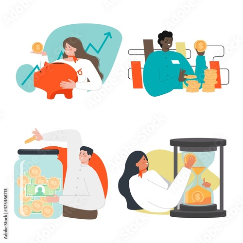 Lidé vydělávání peněz a jejich udržování v prasátko, sklenice, plochý vektor izolované ilustrace. Úspory peněz, bankovní vklad, finanční investice.