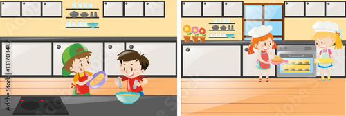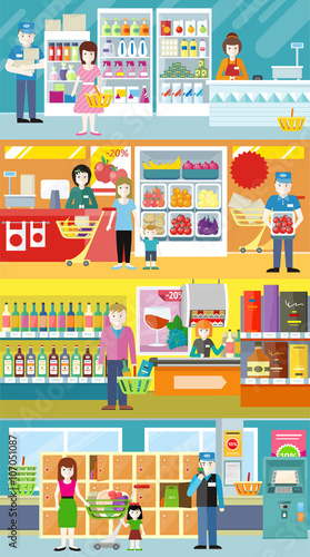 Vektorová sada plakátů s obchodem s potravinami nebo interiérem supermarketu s pokladními, promotéry, kupujícími muži, ženami, rodinami. Lidé, kteří nakupují koncept. Plochý design.