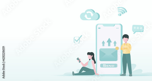 Setkání mužů a žen, chatování na seznamce, aplikace pomocí mobilního telefonu, přenosný počítač, vektorová plochá ilustrace. Online chat messaging, chodit s někým servis, virtuální láska a vztah lidí.