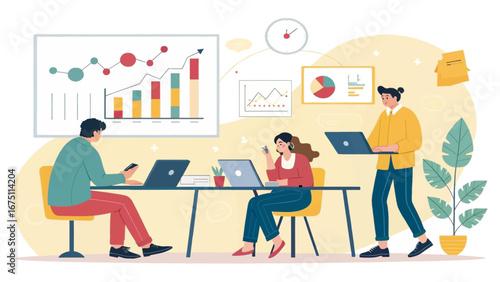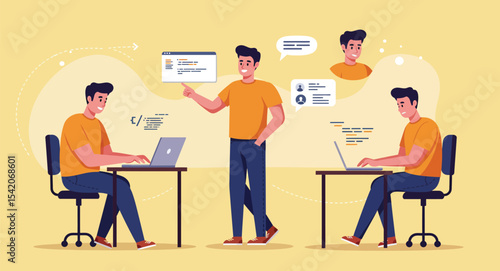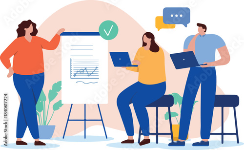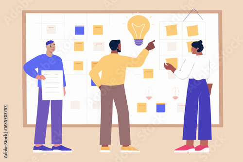 Lidé se pohybují sticky notes na Kanban desce. Agilní koncepce vývoje projektu vektorové ilustrace. Obchodní tým pracuje s agilní metodikou. Denní úkoly probíhají na kanbanové desce.