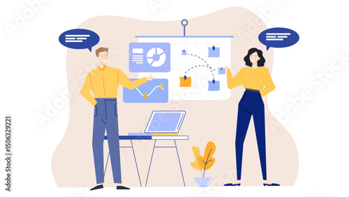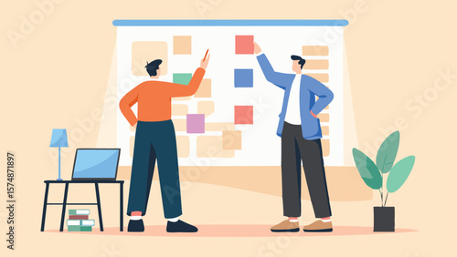 Lidé se pohybují sticky notes na Kanban desce. Agilní koncepce vývoje projektu vektorové ilustrace. Obchodní tým pracuje s agilní metodikou. Denní úkoly probíhají na kanbanové desce.