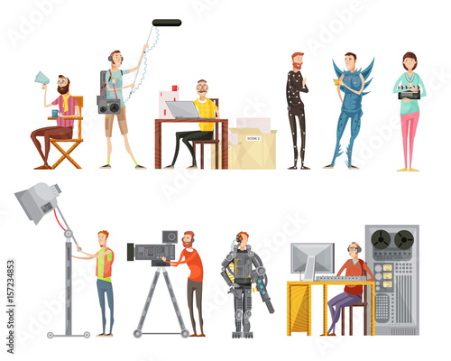 Lidé různých povolání a profesí, ploché vektorové ilustrace. Pracovník v uniformě, sada kreslených postaviček. Kameraman, podnikatel, novinář, zpěvák, policista, stavitel, uklízečka.