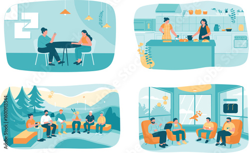 Lidé různých povolání a profesí na pracovišti, ploché vektorové ilustrace. Lékař pediatr, veterinář, vědec, moderátor zpráv, masážní terapeut, rozhlasový hostitel, administrativní pracovník.