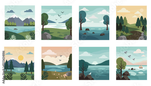 Lidé na kajaku veslování dolů k řece. Vodní dobrodružství sport vektor plakáty set. Muž a žena rafting, jízda na kajaku, kanoistika, držení pádla. Kemp se stanem na jezerní pláži.