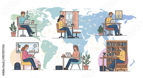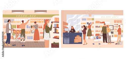 Lidé milovníci domácích mazlíčků navštěvující kočičí kavárnu, plochá vektorová ilustrační sada. Mužské a ženské postavy, zákazníci zaměstnanců kavárny si hrají s rozkošnými kočkami, mazlí roztomilá koťata, jedí sushi, rychlé občerstvení, dezerty.