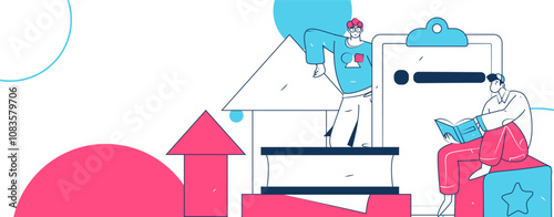 Lidé čtou knihy v knihovně. Vzdělávací a studijní proces. Knihy se vsadily. Vektor web design šablony. Vstupní stránka webové stránky koncept ilustrace.