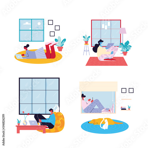 Lidé čtení papíru a elektronických knih vektorové scény set. Studenti využívající cloudovou knihovnu, globální internetovou službu pro ukládání literatury, elektronickou polici a ilustraci učebnic