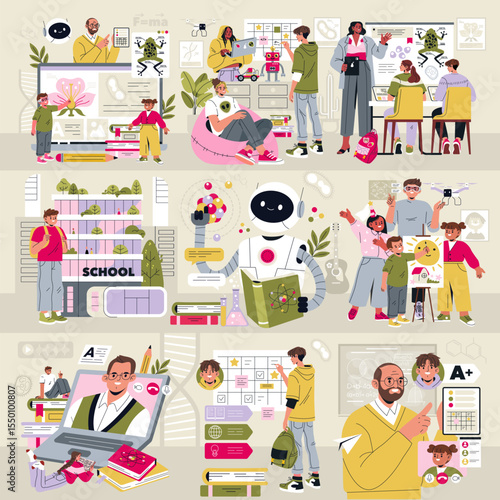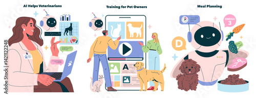 Lidé nahrávají audio podcast nebo online show ve studiu. Koncepční vektorové plakáty. Rozhlasový hostitel rozhovor s hostem. Žena blogger records podcast. Živé vysílání, mikrofon, ikony nahrávání zvuku, sluchátka.