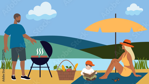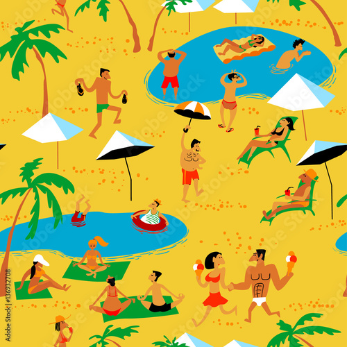 Lidé odpočívají na moři se těší surfování vodní aktivity vektorové ilustrace. Letní jezdci na vlnách se surfy. Tropický Havajský životní styl, exotické letovisko na pláži rekreace