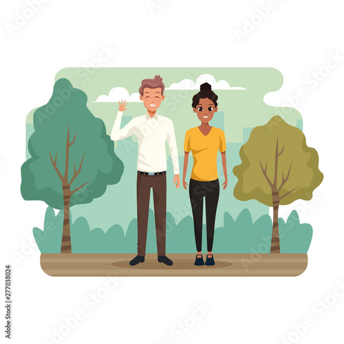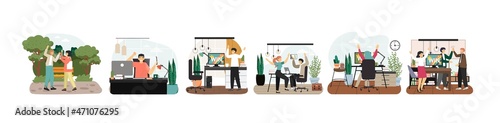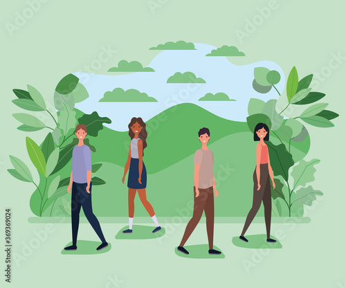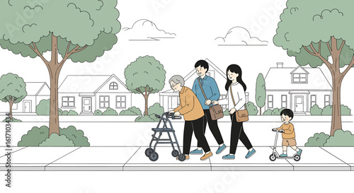 Šťastní lidé na kole, elektrický skútr, skateboarding, trénink venku, pár a máma s kočárkem procházky v městském parku, plochý vektor izolované ilustrace. Venkovní volnočasová aktivita.