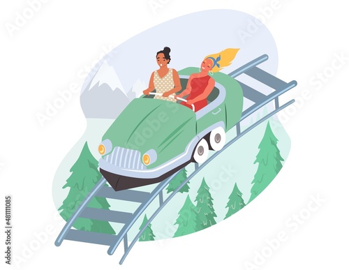 Šťastné dívky na horské dráze, ploché vektorové ilustrace. Výstaviště, atrakce zábavního parku. Zábava, volnočasové aktivity, jízda na horské dráze.