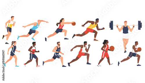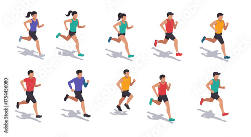 Lidé běžci kreslené postavičky nastavit izolovaných na bílém pozadí. Muž a žena různého věku, fyzické možnosti a různé věkové jogging vektorové ilustrace