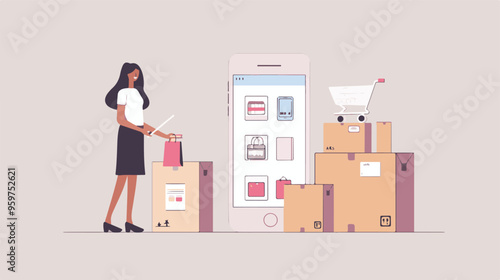 Vektorová ilustrace muže dodávajícího zboží v kartonových krabicích kupujícímu ženě. Doručovací služby Domů. Lidé nakupují plochý designový prvek, ikona izolovaná na bílém pozadí.