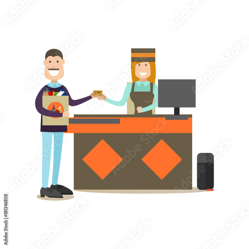 Vektorové ilustrace obchodu s potravinami pokladní žena a nakupující muž platící za nákupy. Lidé nakupují plochý designový prvek, ikona izolovaná na bílém pozadí.
