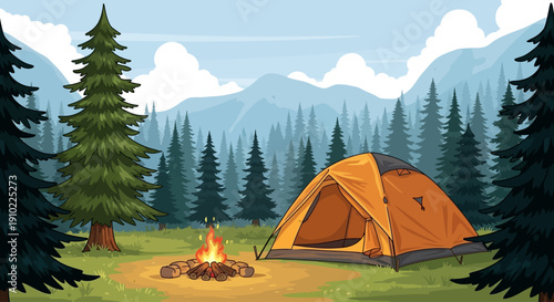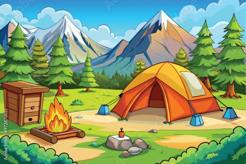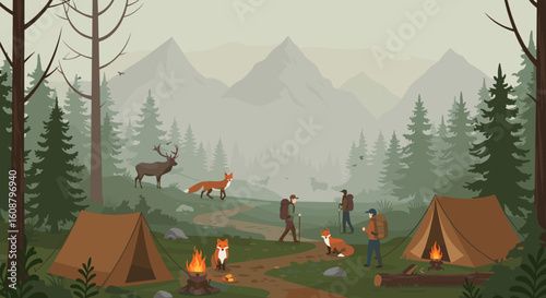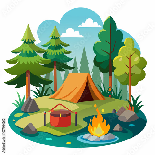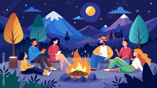 Lidé sedí u táboráku a hrají na kytaru. Skupina přátel vedle kempu stanu a sledování hvězdné noci. Letní tábor dovolená vektor plakát. Horská a jezerní krajina. Dobrodružství, Příroda, táborák.