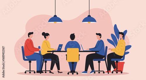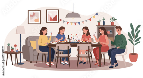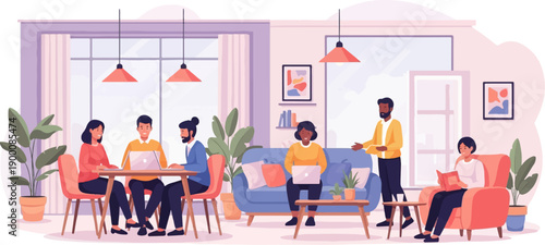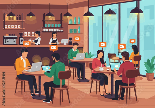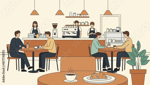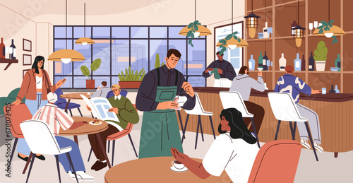 Lidé sedící u barového pultu pijí alkoholický koktejl. Vektorové ilustrace. Barman obsluhující zákazníky v baru. Interiér hospody se stoličkami, policí a lahvemi.