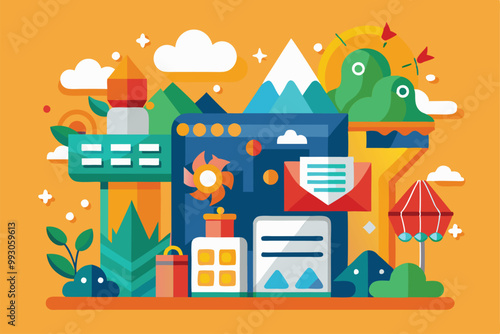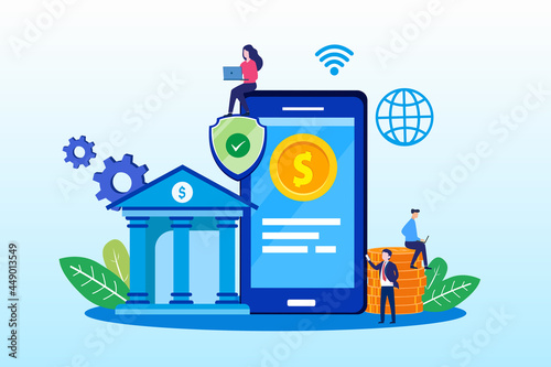 Tiny people, studenti studující angličtinu online, flat vector illustration. Kurzy cizího jazyka online. Distanční vzdělávání, dálkové vzdělávání, elearning.
