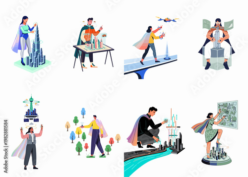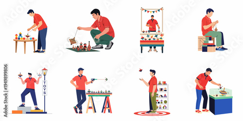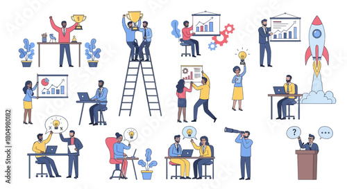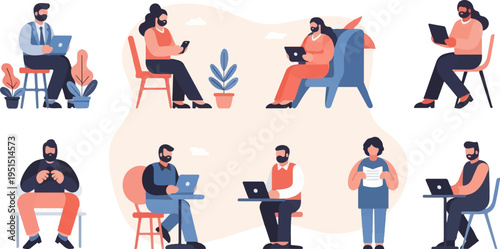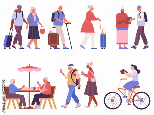 Lidé pijí kávu nebo čaj, zatímco sedí u stolů a mluví mezi sebou, chodí po ulici. Vektorové ploché styl design ilustrace izolovaných na bílém pozadí. Koncept přestávky na kávu.