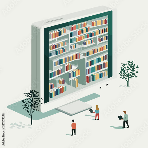 Obří přenosný počítač a malé mužské a ženské postavy využívající mobilní zařízení a bezdrátové připojení k internetu v zóně wifi, plochá vektorová ilustrace. Zdarma wifi hotspot, veřejná přístupová zóna.