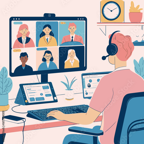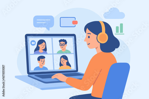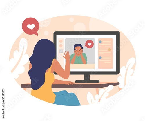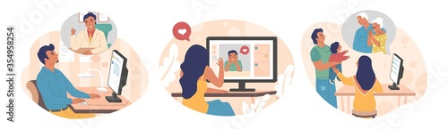 Rodiče a děti, přátelé, šťastný pár video chatování, vektorové ploché ilustrace. Internetová komunikace, živé audio a vizuální připojení, technologie videokonferencí.