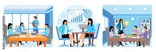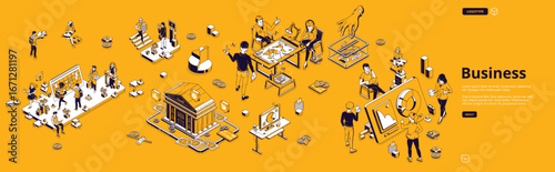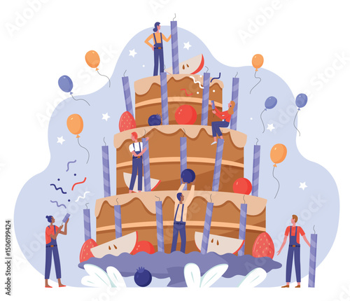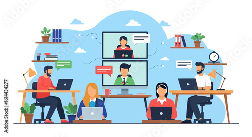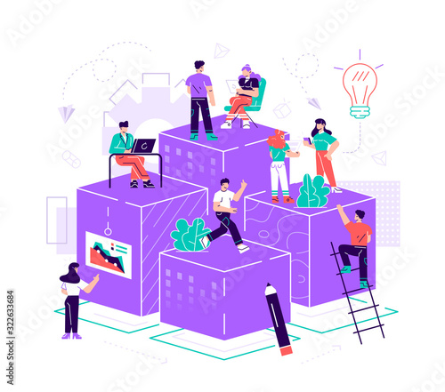 Obrovský kávovar, malé mužské a ženské chracters pití kávy, vektorové ploché ilustrace. Šťastní lidé se setkávají, mluví k sobě, pracují na přenosném počítači v kavárně, coffeeshop.