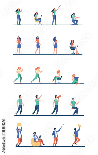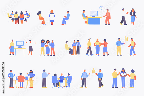Lidé čekající ve frontě u pokladny nebo registračního pultu, vektorové ploché ilustrace. Postavy stojící přímo za lidmi v jedné linii a udržující sociální distancování, v jiných nosit obličejové masky.