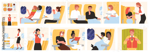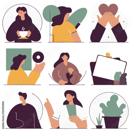 Lidé s nemocnými příznaky doma i na ulici, vektorové plakáty. Studená a chřipková sezóna. Žena v posteli má nachlazení, horečku,nos, kašel a užívání léků. Covidový dav.