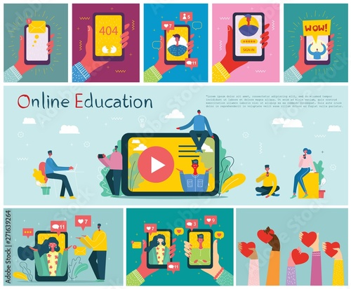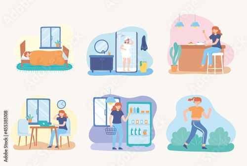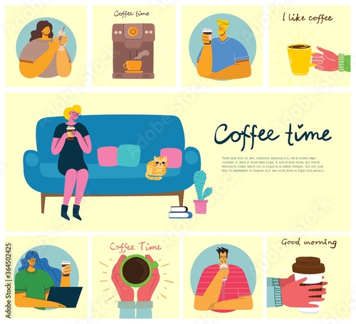 Lidé se špatnými návyky. Vektorové ploché ilustrace. Smartphone, nakupování, kofein nebo káva mánie a jíst nezdravé jídlo. Sada závislostí na chování. Negativní dopad na duševní nebo fyzické zdraví člověka.
