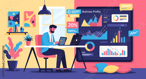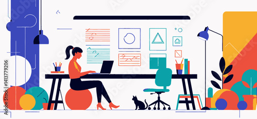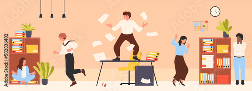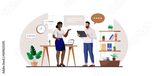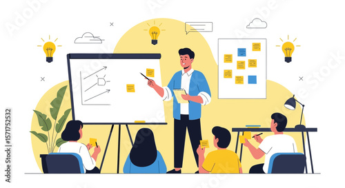 Lidé pracují v kancelářské vektorové ilustraci. Tým zaměstnanců pracuje v obchodním interiéru. Moderní koncept kancelářského pracoviště v plochém stylu. Agile scrum board s úkoly.