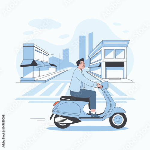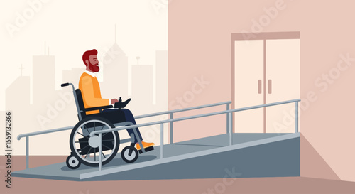Bezbariérové prostředí pro člověka s různými fyzickými schopnostmi vektor. Osoba se zdravotním postižením ve společnosti ilustrace. Muž na invalidním vozíku sestupuje na rampu z budovy