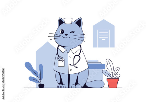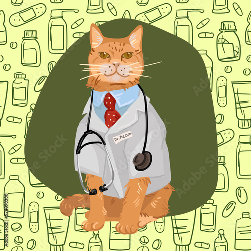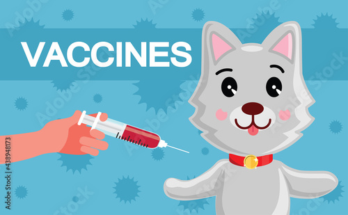 Pet vakcinační papír 3D vektor plakát šablona s veterinářem lékař ruku v gumové rukavice drží stříkačku a šťastný roztomilý objímání štěně, kočka znaky ilustrace přes pilulky pozadí