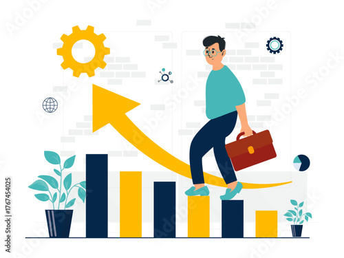 Koncept růstu cen benzinu. Rostoucí náklady na ropu vektor. Podnikatel drží vysoké zvýšení šipku. Ropná čerpací stanice, auto, peníze v hotovosti, graf a graf akciového trhu