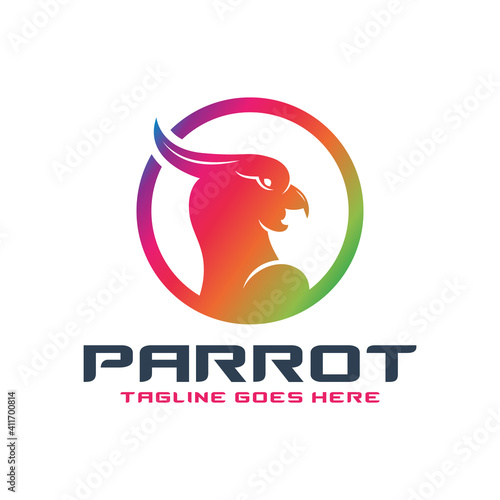 Domácí zvířata obchod logo design šablony. Vektorové papírové umění ilustrace Červené tlapky tisku a psa, kočka a papoušek siluety v něm.