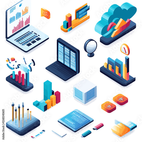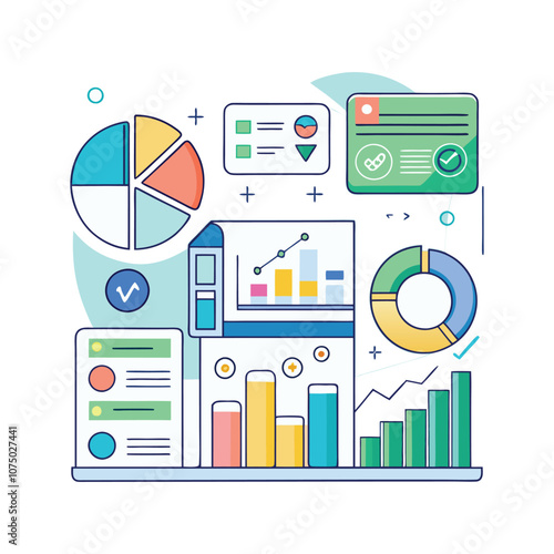 Infografika lékárny, vektorové ilustrace. Izometrický lékař lékárník sloužící zákazníkovi stojícímu u pultu drogerie, léky na předpis, léky pro pacienty, ostatní zdravotnické potřeby s cenami