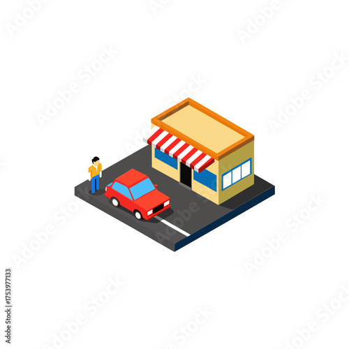 Fasáda lékárny, izometrické vektorové ilustrace izolovaných na bílém pozadí. Budova Drogerie S vývěsní tabulí lékárny a postavami.