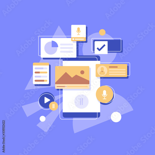 Telefon video aplikace vektor. Mobilní sledování filmů online s ilustrací smartphonu. Přehrávač médií pro živý přenos obsahu, záznam filmu a přehrávání multimediálních souborů