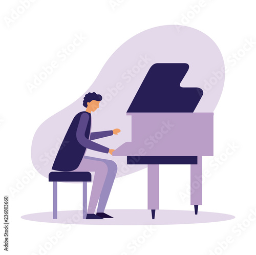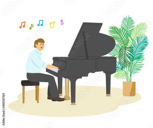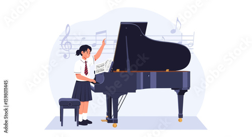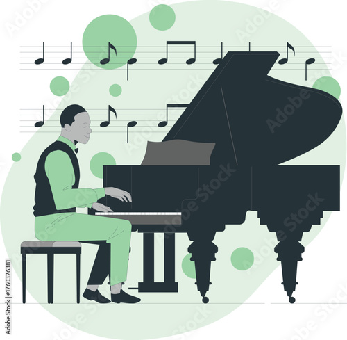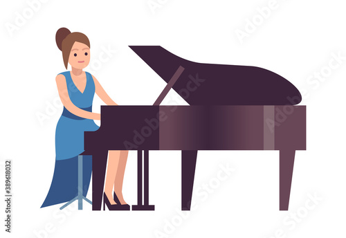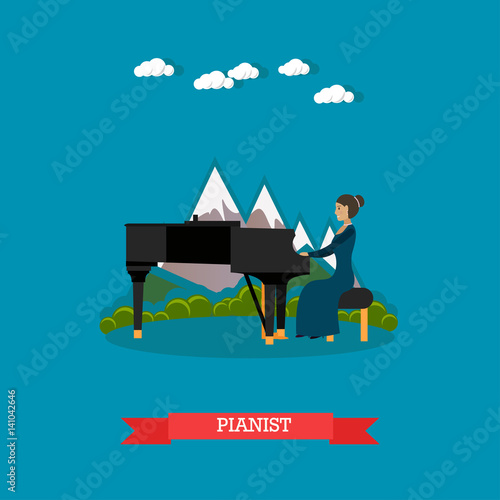 Vektorová ilustrace hudebnice, která hraje na klavír. Pianista hrající hudbu na venkovních prázdninových akcích plochý designový prvek.