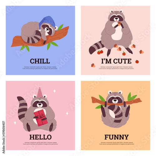 Sada šablon pozvánky na pirátskou párty. Vektorové ilustrace roztomilých zvířat panda, mýval, liška v pirátských kloboucích, loď s pirátskými vlajkami, medúzy s náplastí na oči, ručně psané citace.