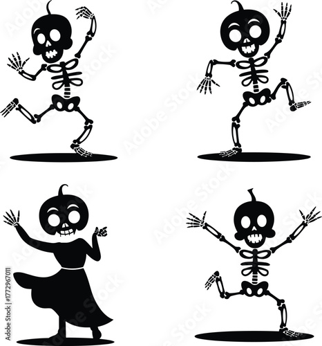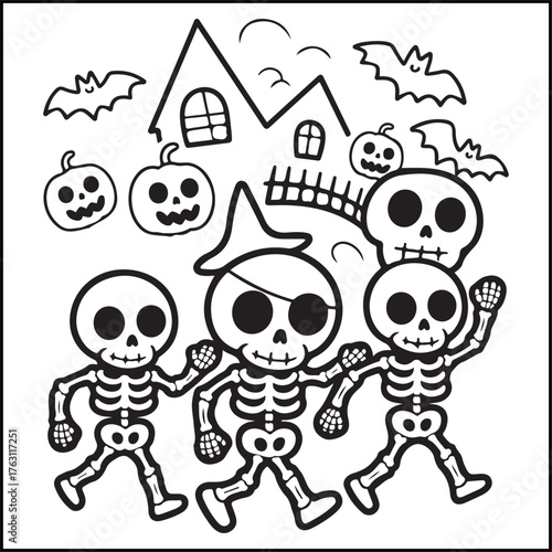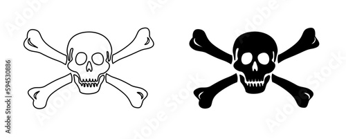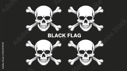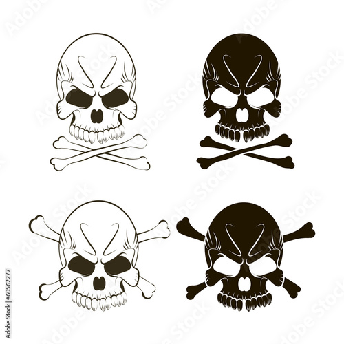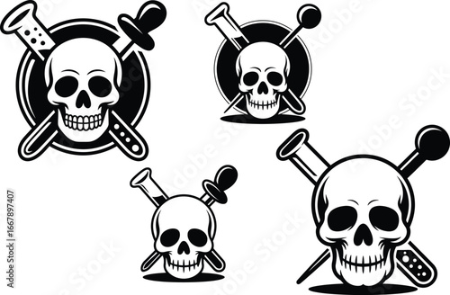Pirátská lebka set, vektorové ručně kreslené ilustrace izolovaných na bílém pozadí. Lidská lebka se zkříženými meči a kostmi, na sobě pirátský kapitán klobouk, šátek, oko. Vintage tetování tričko grafika