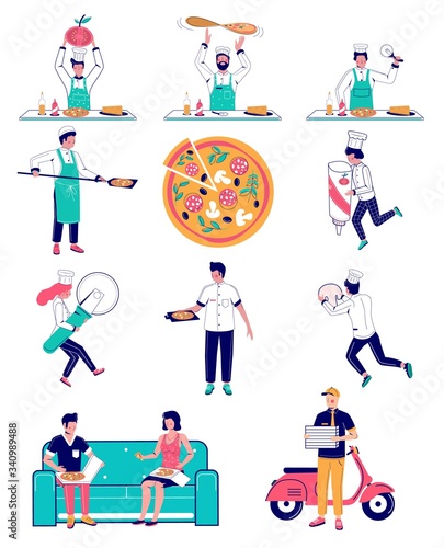 Mikro znaky pizzamakers dělat obrovskou pizzu, kurýr doručování a pár jíst pizzu, vektorové ploché ilustrace. Pizzerie, restaurace rychlého občerstvení, koncept rozvozu jídla pro webový banner, webová stránka