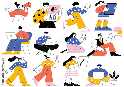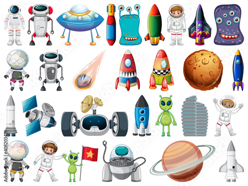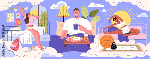 Planetárium, prostor Muzeum scéna set, ploché vektorové ilustrace. Lidé, kteří se dívají na noční oblohu, planety sluneční soustavy, hvězdy, nebeská tělesa dalekohledem, poslouchají průvodce. Astronomické vzdělávání.