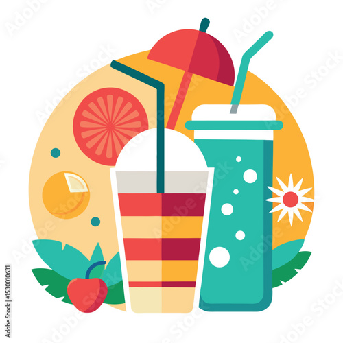 Stánek s jídlem káva, čaj šálek reklamy šablony, vektorové ilustrace. Prázdný plastový jednorázový pohár realistická maketa na pódiu, pozadí podzimní sezóny řezané papírem s červenými a žlutými listy, deštník.