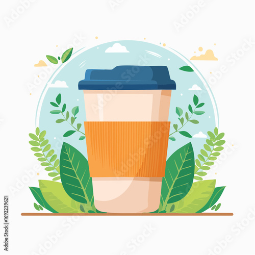 Stánek s jídlem káva, čaj šálek reklamy šablony, vektorové ilustrace. Prázdný plastový jednorázový pohár realistická maketa na pódiu, pozadí podzimní sezóny řezané papírem s červenými a žlutými listy, deštník.