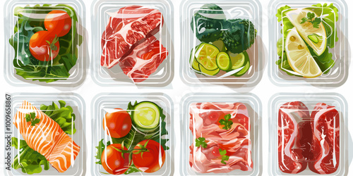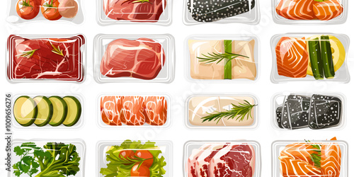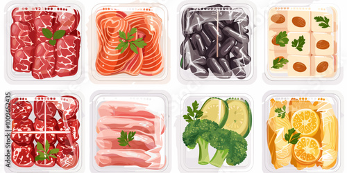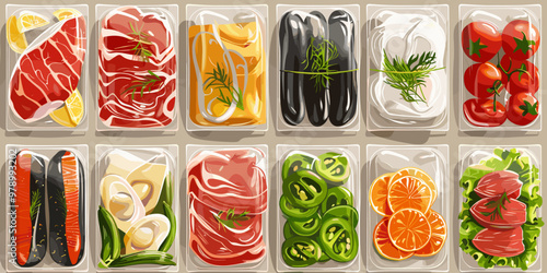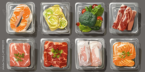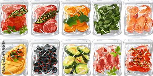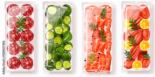 Plastové balíčky s čerstvou zeleninou vakuové potraviny izolované vektorové sady. Zapečetěný mražený balíček supermarketu s mrkví, pepřem, cibulí, okurkou, rajčaty a brokolicí ilustrace