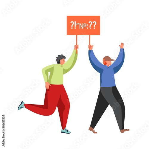 Dva političtí aktivisté mužské postavy držící banner nebo transparent, vektorová plochá ilustrace izolovaná na bílém pozadí. Volební kampaň, demonstrace, politický protest, předvolební agitace, setkání.
