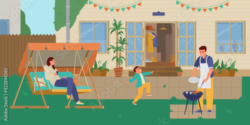 Pool Party koncept vektorové ilustrace. Letní dovolená u bazénu. Šťastní lidé plavou v bazénu, pijí a tančí. Párty u bazénu s DJ.