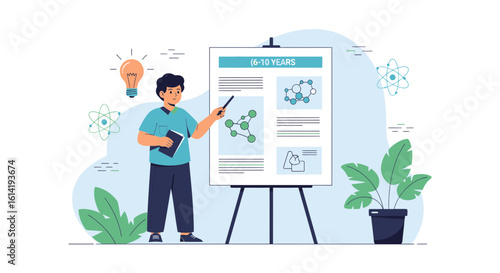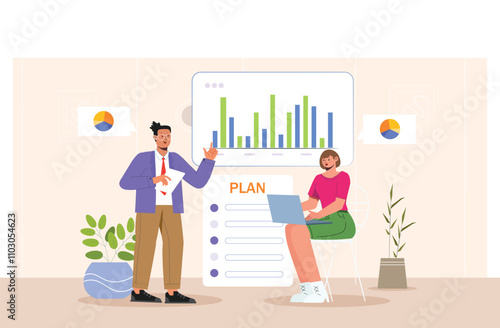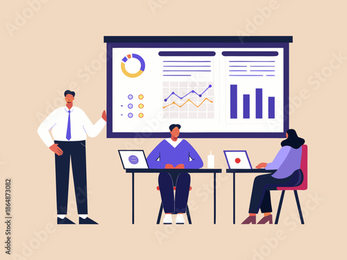 Vektorové ilustrace obchodní žena dává prezentaci. Přednášející žena ukazující na diagram na tabuli. Plochý design.